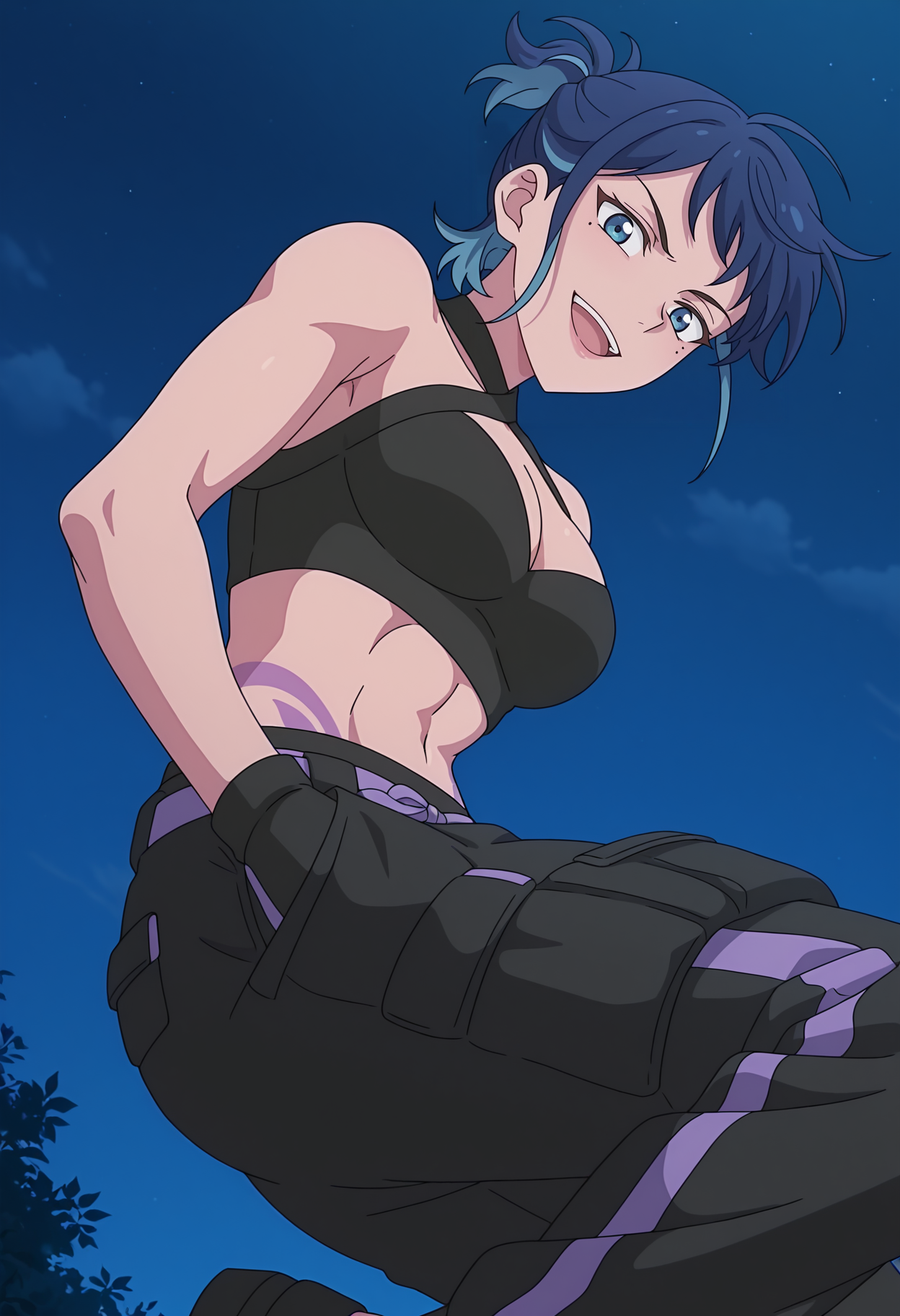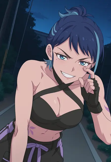 rhbdjuna, blue hair, blue eyes, mole under eye, toned,