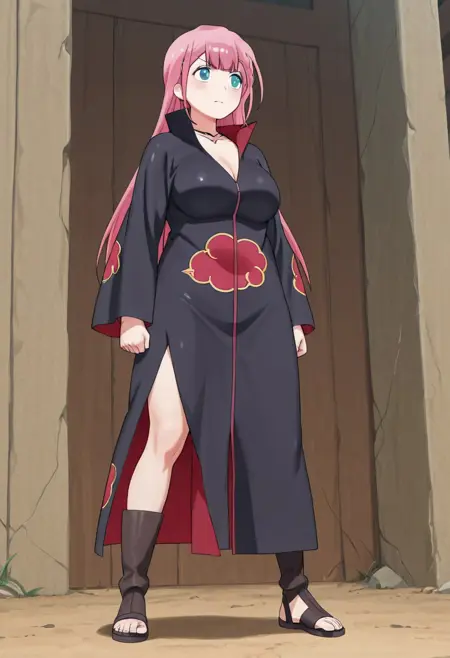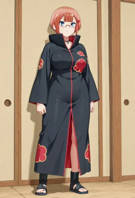 Akatsuki cloak, long cloak, black cloak, decorated with red clouds with white edges, shinobi sandals,