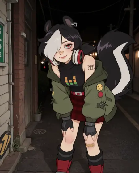 外观: L1c0r1c3,1个女孩,黑发,白发,发色条纹,头发遮住一只眼睛,动物耳朵,红眼,尾巴,脸上有创可贴,纹身