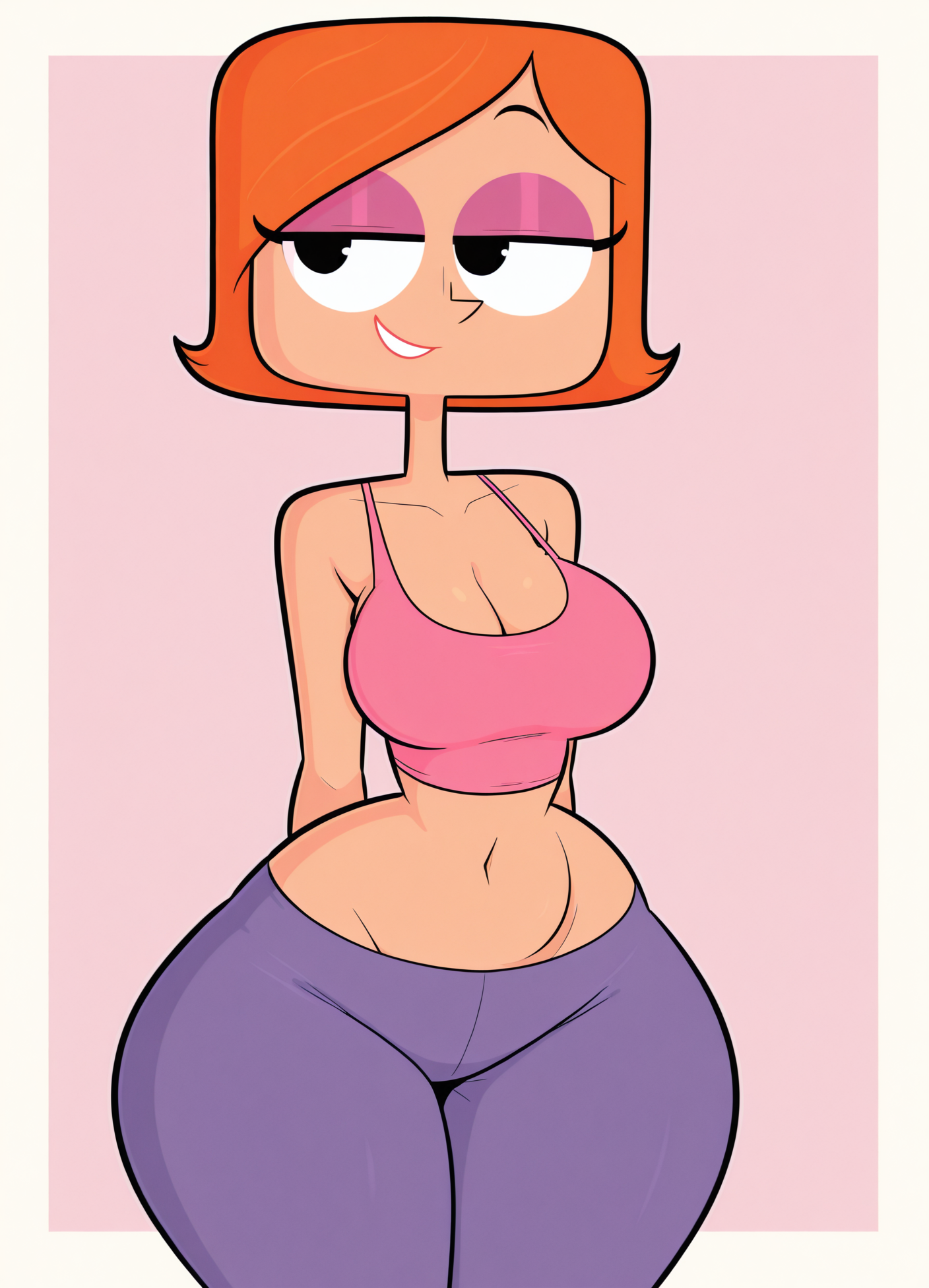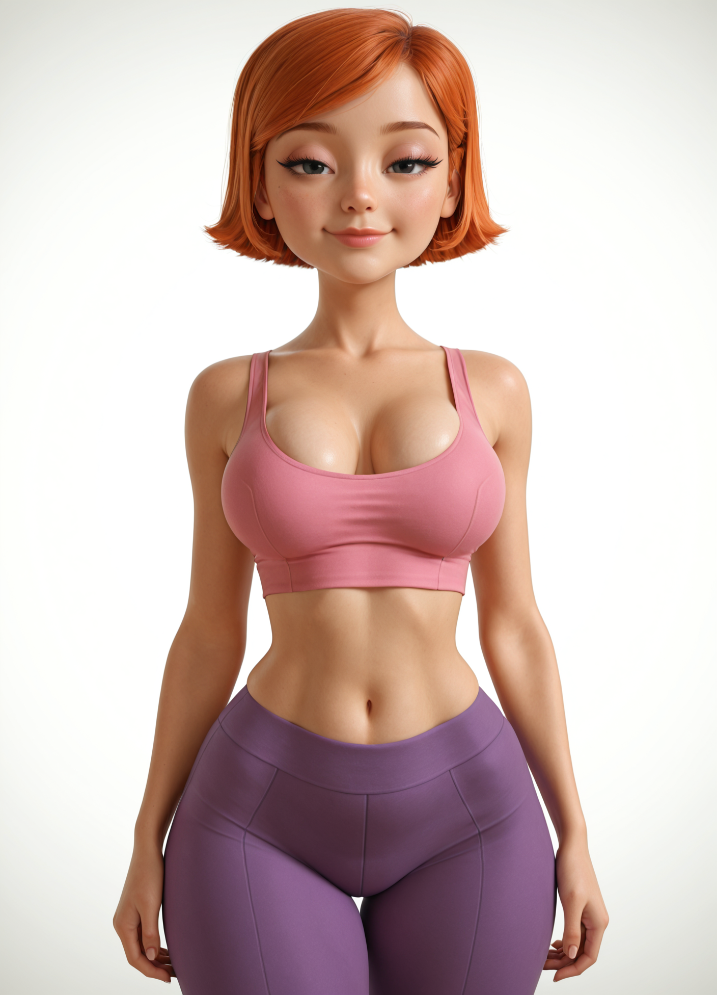 debbiet112, 넓은 엉덩이, 오렌지색 머리, 핑크색 커프스 상의, 두꺼운 허벅지, 검은 눈, 짧은 머리, 보라색 바지, 메이크업, 보라색 아이섀도우, 요가 팬츠,