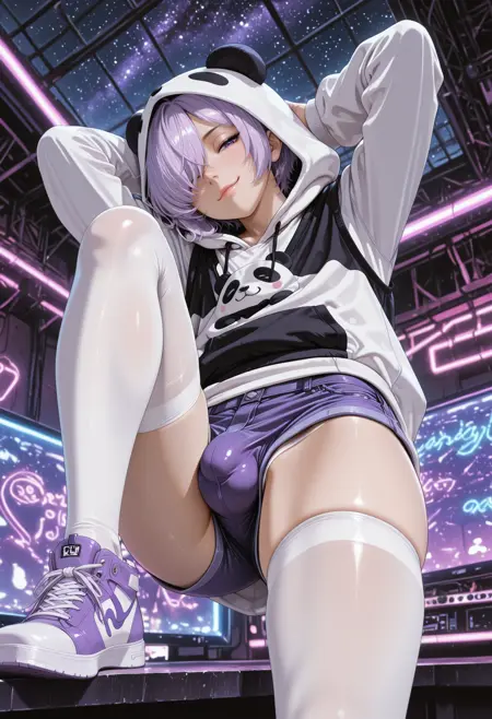 我用于获得更一致结果的一些标签:"inga, 1boy, otoko no ko, 紫色眼睛, 黑色眉毛, 紫色头发, 头发遮住一只眼睛, 白色熊猫连帽衫, 黑色背心, 紫色牛仔短裤, 白色过膝袜, 紫色运动鞋"