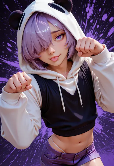 더 일관된 결과를 위해 내가 사용하는 일부 태그: "inga, 1boy, otoko no ko, 보라색 눈, 검은 눈썹, 보라색 머리, 한쪽 눈 위의 머리카락, 흰색 판다 후디, 검은 조끼, 보라색 데님 반바지, 흰색 허벅지 긴 양말, 보라색 스니커즈,"