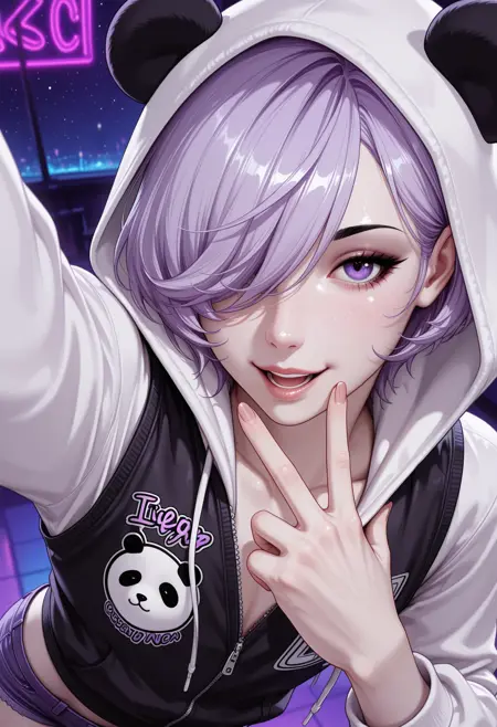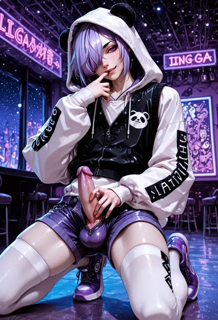 我用于获得更一致结果的一些标签:"inga, 1boy, otoko no ko, 紫色眼睛, 黑色眉毛, 紫色头发, 头发遮住一只眼睛, 白色熊猫连帽衫, 黑色背心, 紫色牛仔短裤, 白色过膝袜, 紫色运动鞋"