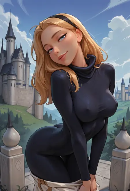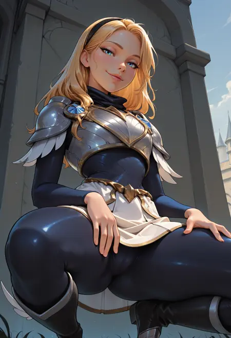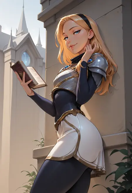 luxil, 长发, 蓝眼睛, 裙子, 金发, 长袖, 发带, 护甲, 连体衣, 黑色连体衣, (蓝色连体衣:0.8), 裤子, 黑色发带, 过膝靴, 宝石, 胸甲, 肩甲, 白色裙子, 嘴唇,