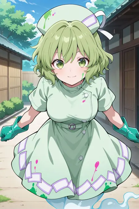 soga no tojiko, 1girl, solo, green eyes, green hair, short hair, ghost tail, medium brests,, soga no tojiko \(electric nurse\), alternate costume, alternate headwear, nurse, nurse cap, light green hat, hair ribbon, putple ribbon, light green shirt, buttons, short sleeves, green gloves, rubber gloves, light green belt, shoulder bag, light green skirt, ofuda on clothes, paint stains, stained clothes,