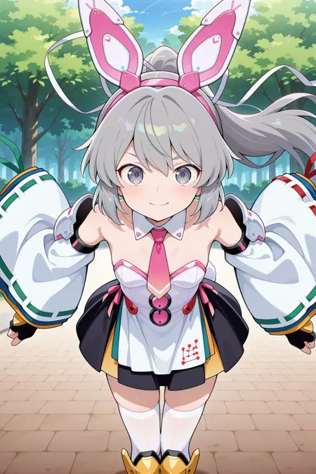 mononobe no futo, 1girl, solo, grey eyes, grey hair, long hair, ponytail,, mononobe no futo \(master taoism bunny\), alternate costume, pink hairband, animal ear hairband, fake rabbit ears, futuristic dress, detached collar, white collar, pink necktie, white pauldrons, white dress, strapless dress, nontraditional playboy bunny, detached sleeves, wide sleeves, ribbon-trimmed sleeves, armored bracelet, black gloves, fingerless gloves, multicolored dress, black skirt, futuristic skirt, rabbit tail, white thighhighs, armored boots, black shoes,