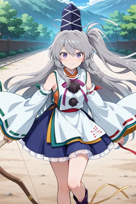 mononobe no futo, 1girl, solo, purple eyes, grey hair, very long hair, side ponytail, aged up, medium breasts,, mononobe no futo \(A13-agedup\), alternate costume, alternate hairstyle, alternate hair length, blue hat, tate eboshi, japanese clothes, kariginu, pom pom \(clothes\), sleeveless shirt, orange shirt, white tabard, detached sleeves, ribbon-trimmed sleeves, long sleeves, wide sleeves, blue skirt, frilled skirt, purple boots, holding bow \(weapon\),