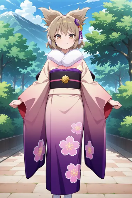 toyosatomimi no miko, 1girl, solo, brown eyes, brown hair, short hair, pointy hair, toyosatomimi no miko \(dojo safety saint\), alternate costume, hair ornament, kanzashi, fur-trimmed earmuffs, white earmuffs, gradient kimono, pink kimono, purple kimono, furisode, long sleeves, wide sleeves, floral print, black obi, purple obiage, sash, white socks, tabi,