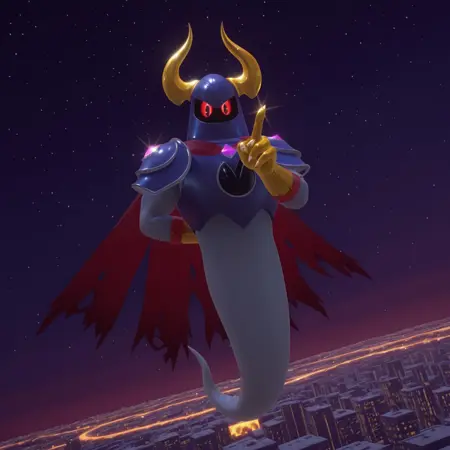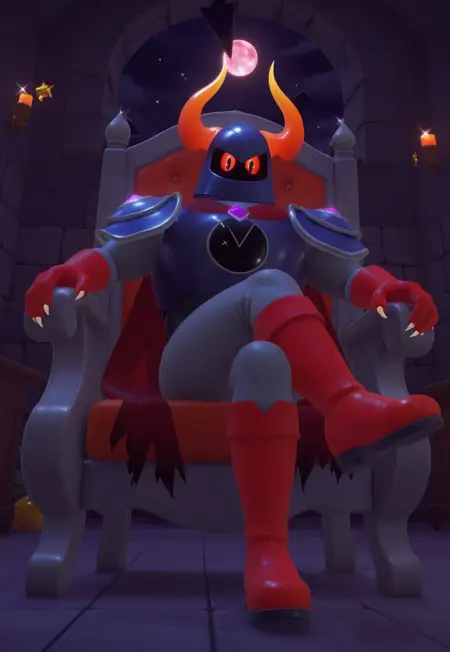 "유령, 유령 꼬리, 다리 없음, 금색 몸, 금색 헬멧, 뿔, 검은 눈, 붉은 공막, 금색 갑옷, 금색 어깨 갑옷, 금색 장갑, 찢어진 망토, 금색 망토, 금색 발톱, 금색 형태 (+ 금색 지팡이 든 상태)" - (완전히 금색 형태)
