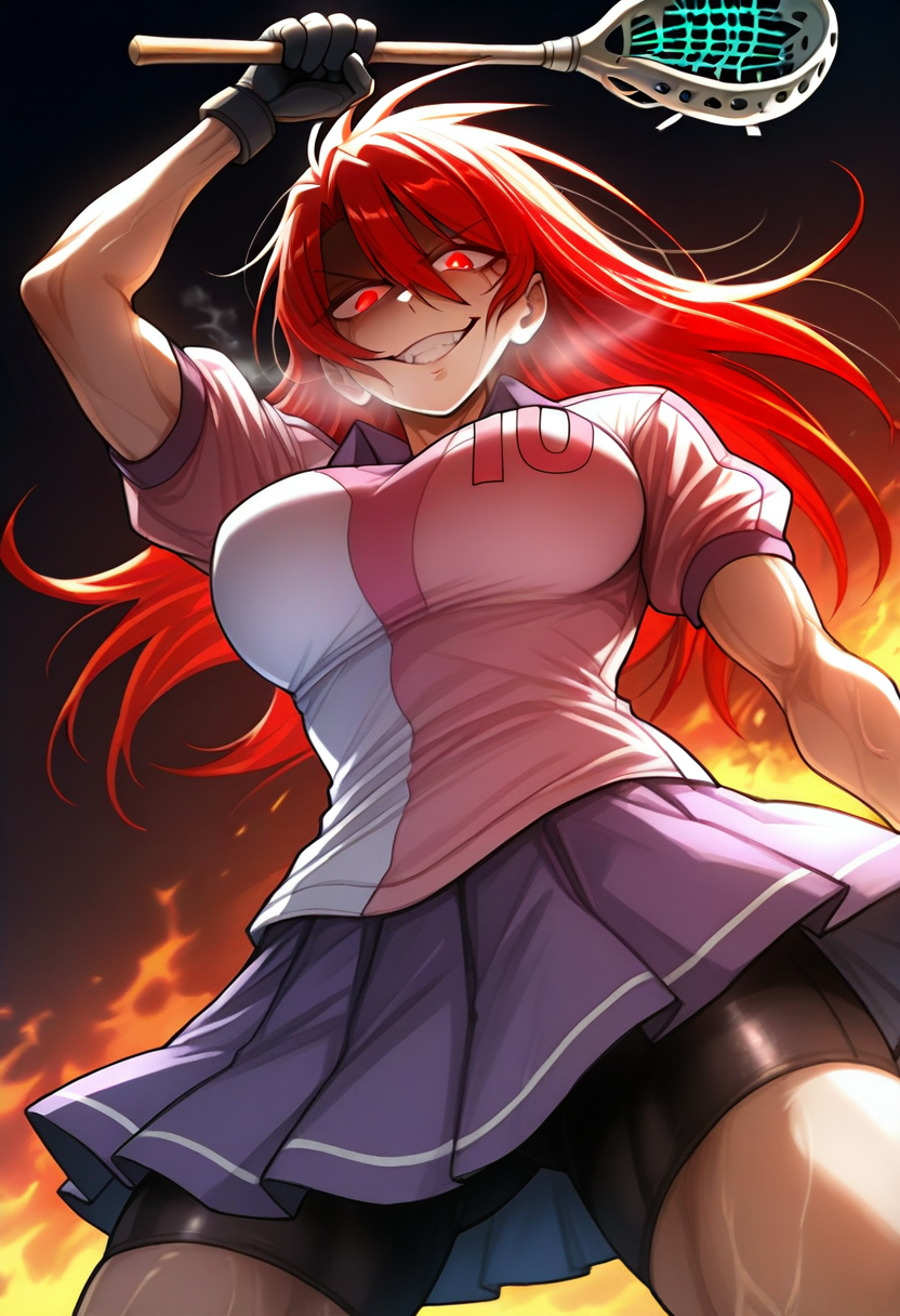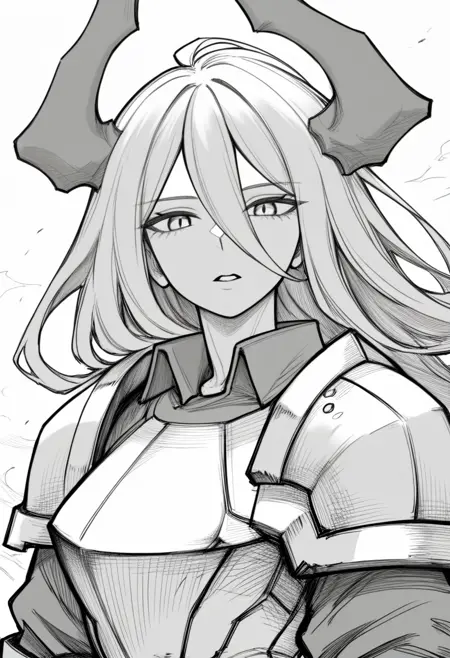 Doomsiaのトリガーワード: doomsia, 1girl, long hair, hair between eyes, white hair, red horns, red eyes, armor