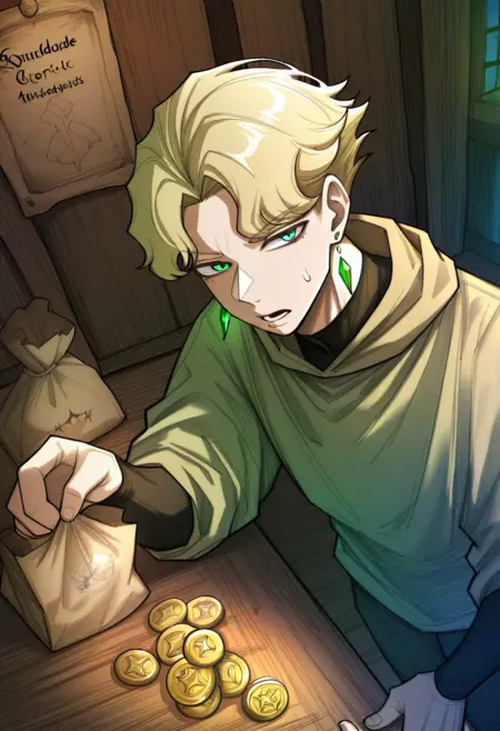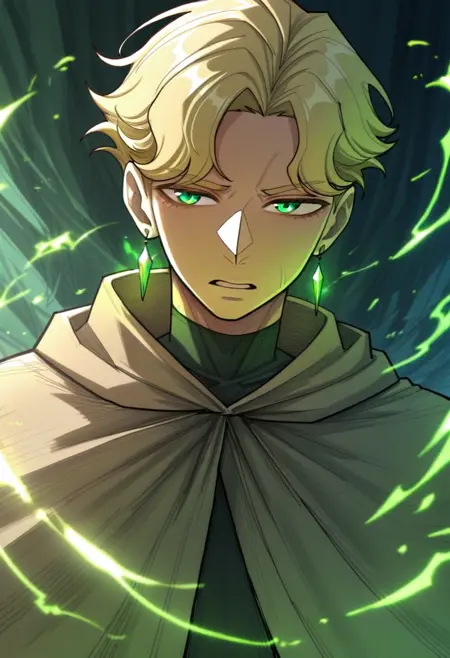 Clericのトリガーワード: cleric, 1boy, blonde hair, short hair, green eyes, cape, crystal earrings