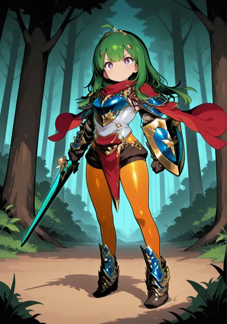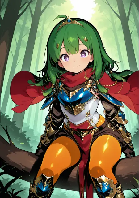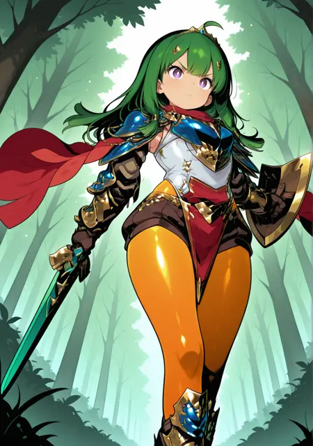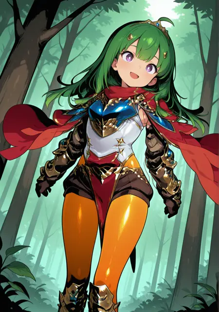 推荐:绿发,紫眼,长发,呆毛,胸甲,胫甲,明亮的瞳孔,臂甲,护腿靴,棕色手套,棕色短裤,肩甲,骨盆帘,超短裤,鬓发,发饰,橙色连裤袜,红色斗篷,肩部护甲,王冠,白色瞳孔,