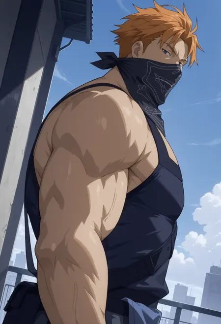 orange spiky hair, black bandana on face, black tanktop, large tattoo on left arm, black strap across chest