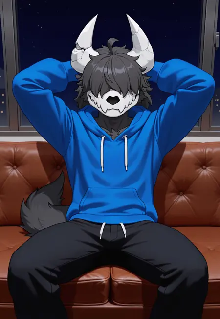 Kurrozz,hair_over_eyes,fluffy,covered eyes,wolf_tail,furry,black_hair,animal_skull,black_skin,deer_skull,broken_horn,buffahorn,horns,tail,teeth,upper_teeth_only,blue_hoodie,Black_pant