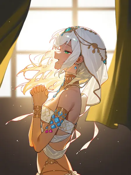 プロンプト:Nita, Nita-Pluse_(Silken Dance), 暗色肌の女性, 緑色の目, 白髪