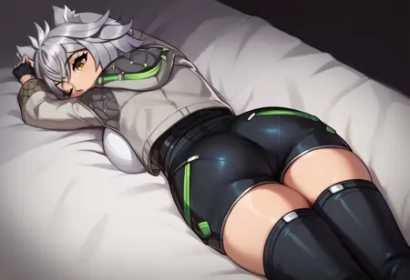 (Xenoblade_Nael, 短发, 灰发, 黄眼, 动物耳朵, 无指手套, 短裤, 上衣, 夹克, 大腿靴)