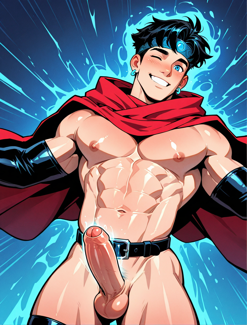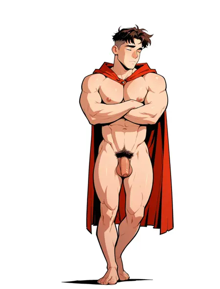 wiccan, solo, short hair, simple background, brown hair, black hair, white background, 1boy, navel, standing, nipples, full body, male focus, nude, one eye closed, penis, barefoot, cape, looking to the side, pubic hair, muscular, uncensored, abs, muscular male, pectorals, testicles, crossed arms, standing on one leg, bara, male pubic hair, toned, red cape, undercut, toned male, foreskin, flaccid, phimosis, naked cape