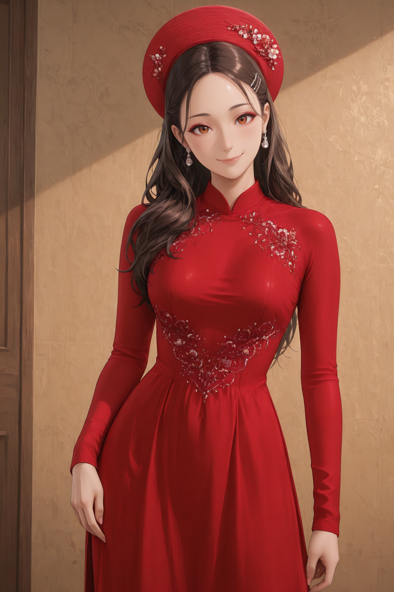 • aodai-cuoi, headwear, loose clothes, see-through clothes, red dress, skin tight, earrings, hairclip, hair ornament, long sleeves, silk, jewelry, glitters, embroidery, floral print, (lowleg pants, :1.2), side slit