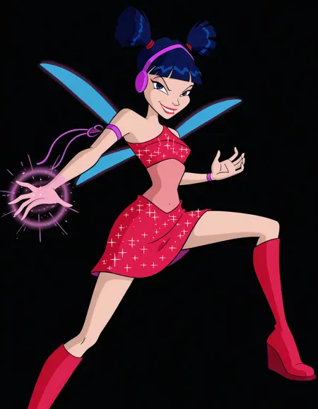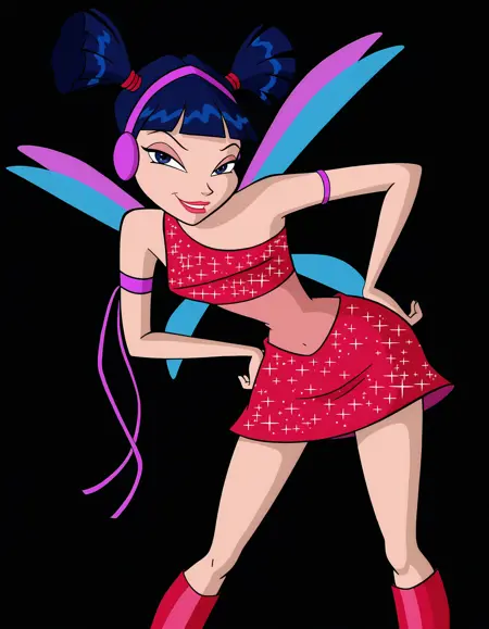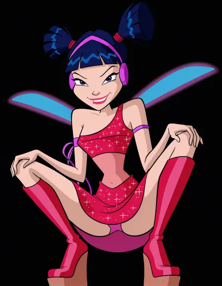 요정 날개, 헤드폰, 글리터 의상, 한쪽 어깨 노출 드레스, 투명한 허리 부분, 무릎 부츠, 팔 밴드, 팔 리본, 융단힐