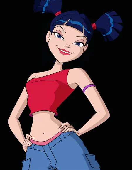 한쪽 어깨 노출 상의, 크롭탑, 팔 스트랩, 카고 팬츠, 분홍색 속옷, 빨간 신발 - 신발은 약간 '펑키'한 느낌인데, 잘 찍힌 사진이 없었음을 이제야 깨달았어, 그래서... 어쨌든.