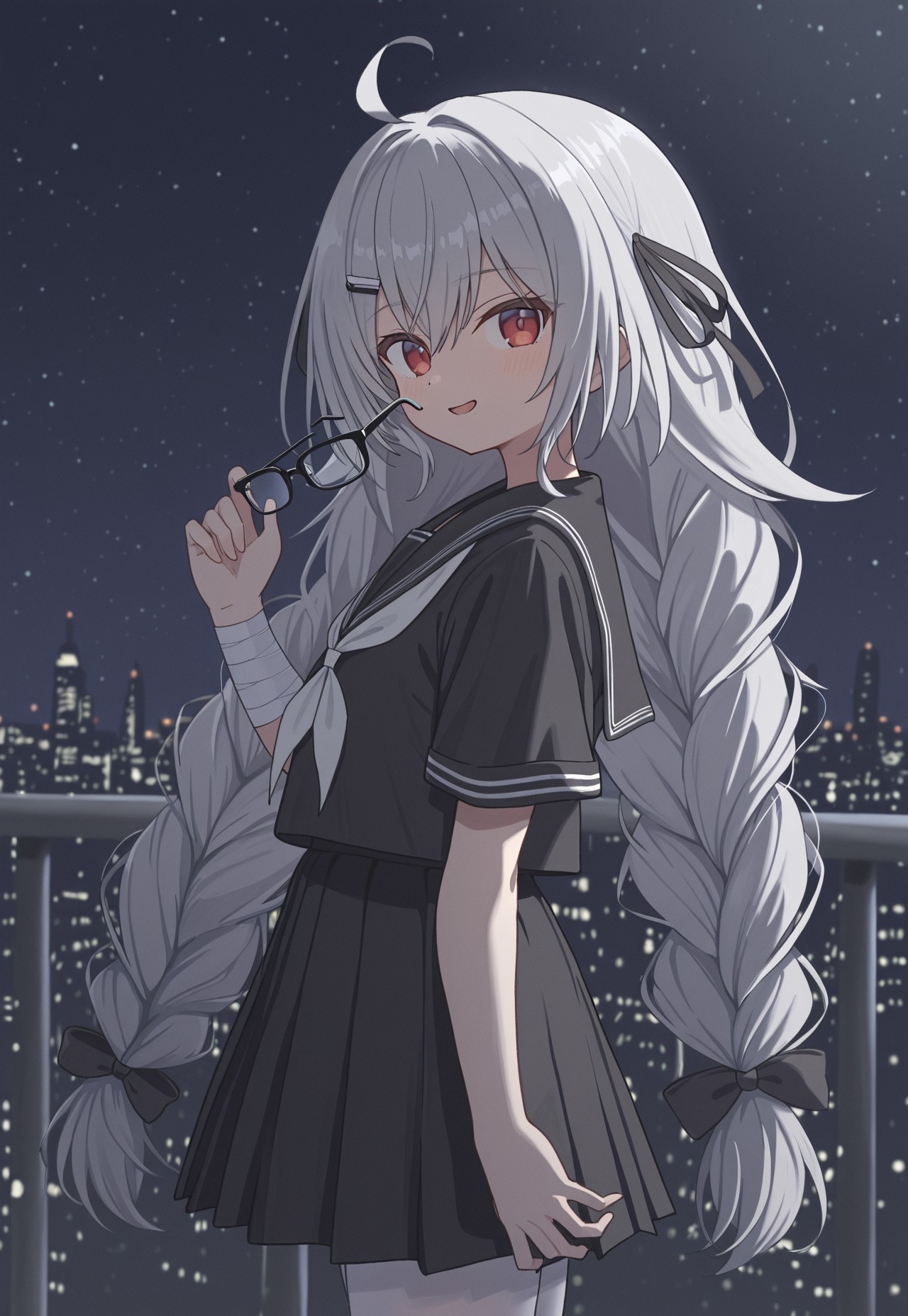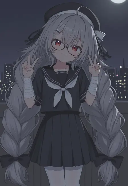 RyogokuTsukasa、非常に長い髪、赤い目、髪飾り、前髪、長袖、黒いジャケット、赤いネクタイ、黒い手袋、灰色の髪、軍服、シャツ、アホ毛、眉間の髪、プリーツスカート、腕章、黒いタイツ、黒い頭部装具、尖ったキャップ、衿付きシャツ、ベルト、黒いシャツ、ボタン、ダブルブレス、髪留め、V字型の眉、肩章、袖が手首より長い、ガーターストラップ、アイキレット、