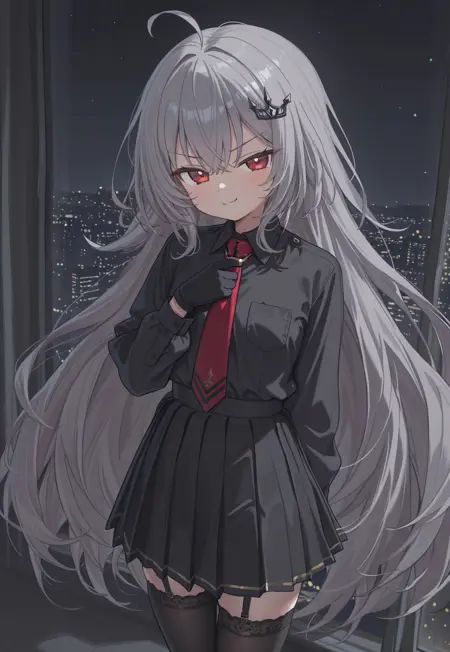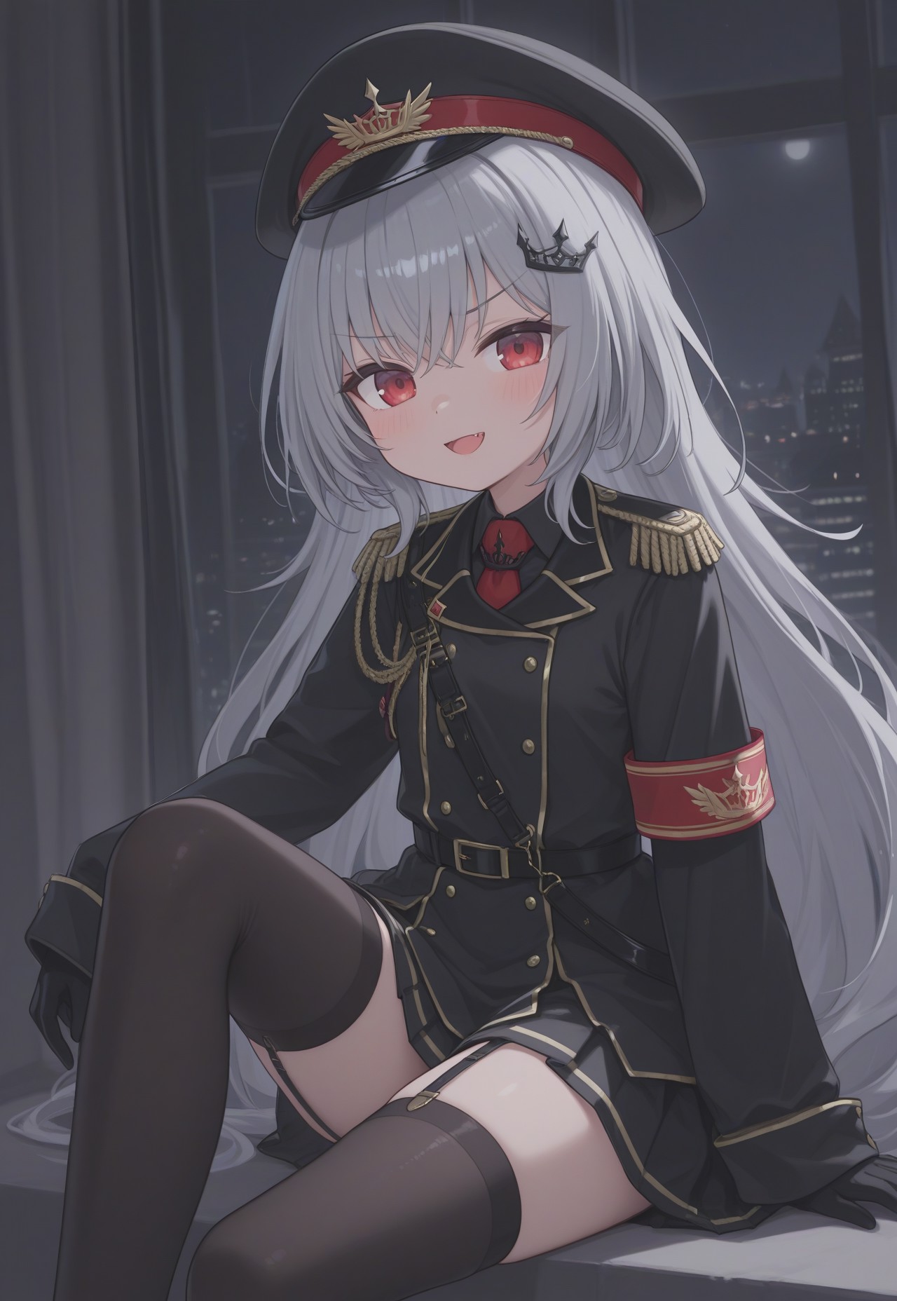 RyogokuTsukasa, 매우 긴 머리카락, 붉은 눈, 머리 장식, 앞머리, 긴 소매, 검은 재킷, 빨간 넥타이, 검은 장갑, 회색 머리카락, 군복, 셔츠, 아호게, 눈 사이의 머리카락, 주름치마, 팔찌, 검은 허벅지 스타킹, 검은 머리 장식, 뾰족한 모자, 단추가 있는 셔츠, 벨트, 검은 셔츠, 단추, 더블 브레스트, 머리핀, V자 모양의 눈썹, 어깨장식, 손목을 넘는 소매, 게터 스트랩, 아이퀼렛,
