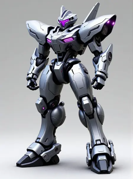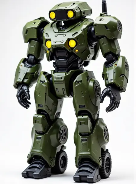 橙黑配色的重型装甲,头部设有方形驾驶舱,配备平静而坚固的绿色光学镜片。双肩装备大型液压钳和破碎器,躯干如工程机械底盘般坚固。双臂粗如钢柱,腿部采用多轮承重结构。全身布满机械关节和工具接口,散发出力量与功能性之感。