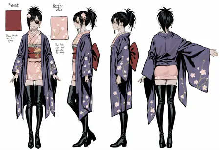 別の衣装2: 短髪、ポニーテール、髪飾り、和服、太ももハイ、着物、ピンクの着物、短い着物、帯、絶対領域、花柄、太ももブーツ、黒い太ももハイ、羽織、ブーツ、ジュエリー、ピアス