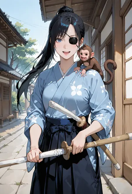 衣装: ポニーテール、下駄、和服、コート、帯、天狗下駄、トレーンコート、白いコート、ズボン、靴下、着物、长袖