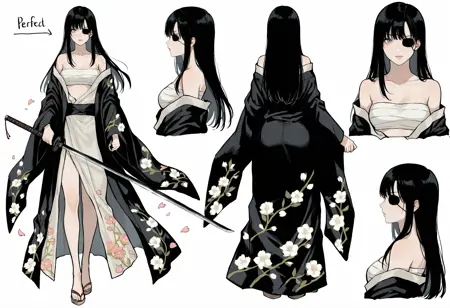 スタイリッシュな衣装: 肉桂、和服、襷、着物、花びら、胸、肩出し、オフショルダー、開いた着物、開いた服、帯、花柄、中程度の胸、黒い着物