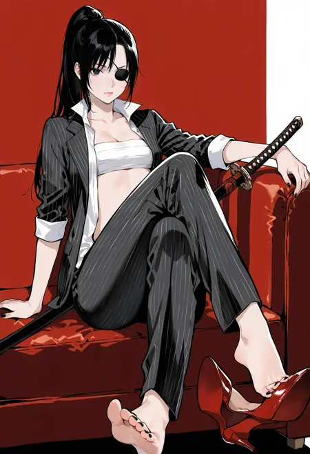 現代的な衣装: ポニーテール、ハイヒール、襷、縞模様、小ぶりな胸、中程度の胸、縞、スーツ、フォーマル、ピナコールスーツ、靴、ジャケット、開いた服、ズボン、胸、赤い靴、開いたシャツ、シャツ、袖をまくった、包帯、素足