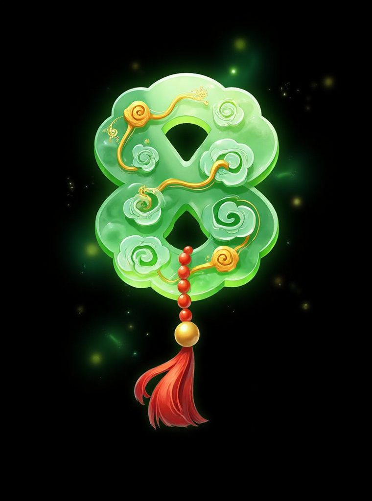 水墨图标,插画。一只蓝绿色葫芦,釉面如冰似玉,饰以云纹,优雅地覆以金饰,用红绳缠绕,点缀透明珠子与红色流苏,在深灰色背景衬托下更显通透。类似藏族仙家的灵液,具有古典奇幻的设计风格,细节中的纹理与配饰巧妙融合了传统葫芦的象征意义与奇幻物件的质感。