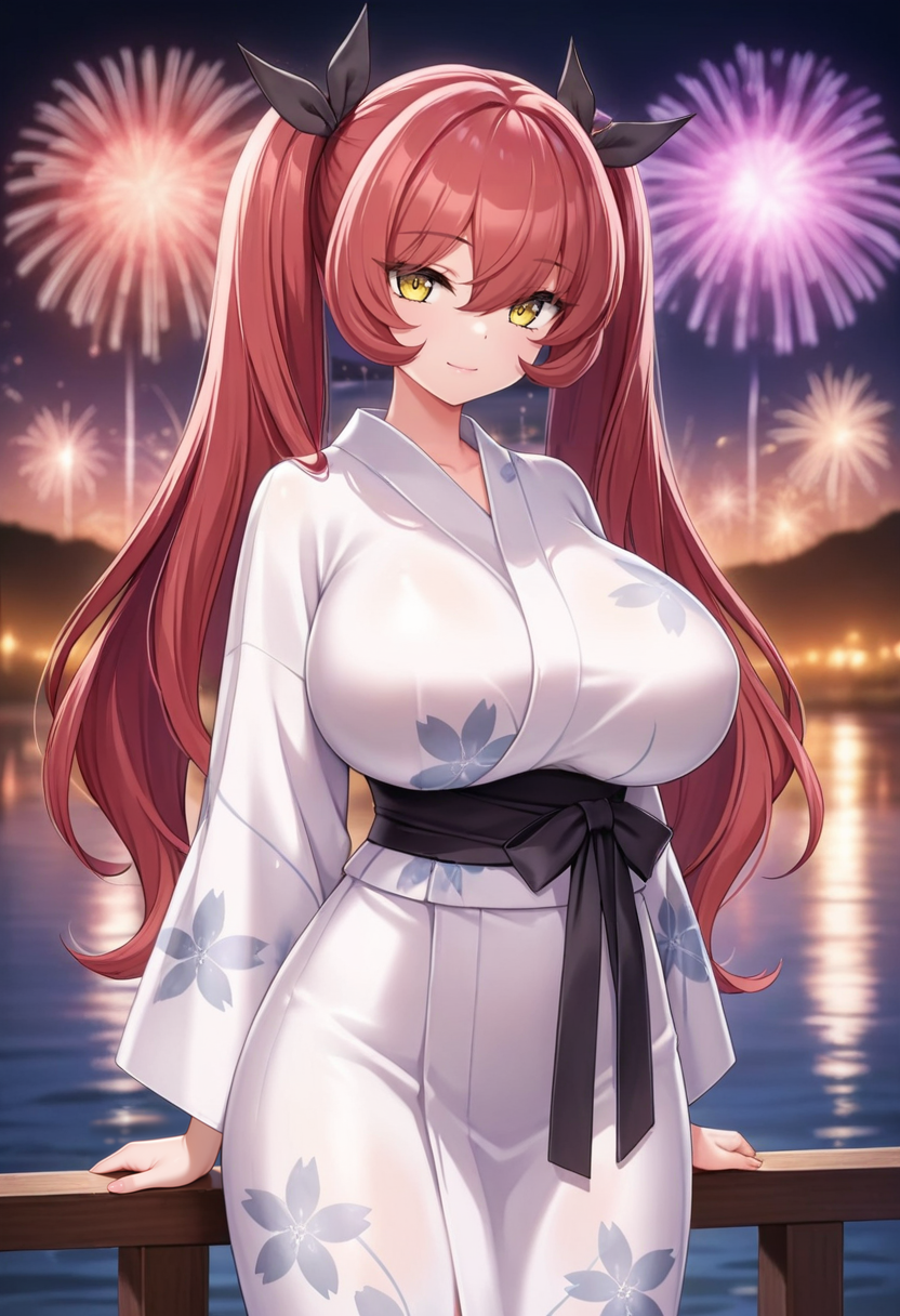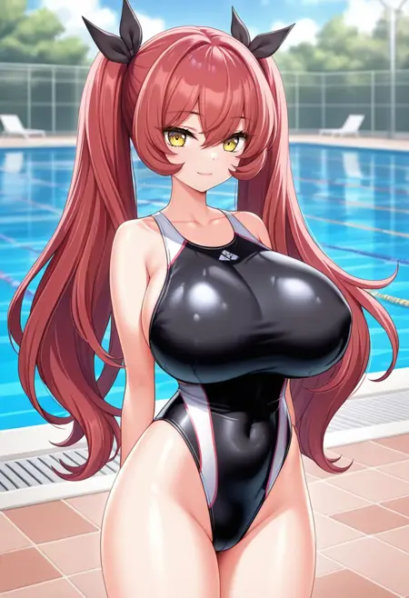 黄色い目、赤い髪、ヘアリボン、黒いリボン、ツインテール