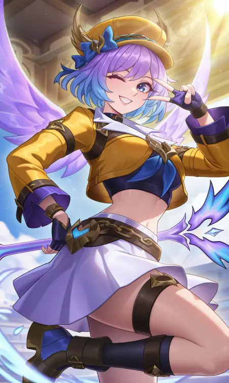 sflux、イエロージャケット、青い目、中程度の胸、グラデーションヘア、紫髪、複色ヘア、青い髪、指なし手袋、黒いショートトップ、手首バンド、腹部、脚バンド、スカート、ブーツ、黒い太ももハイ、ひざ下ソックス、翼、杖