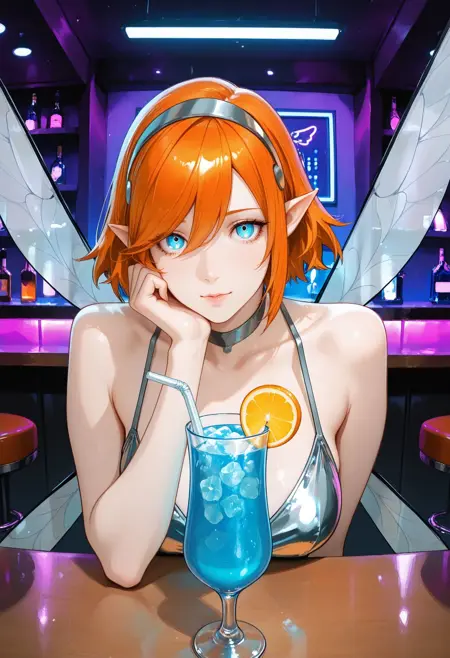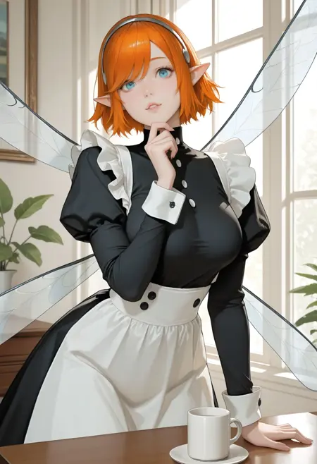 MReFG4ll1c4, 1girl, blue eyes, pointy ears, orange hair, short hair, bangs, Grey hairband, fairy wings