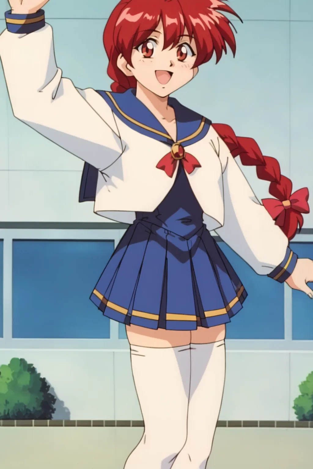 AmytoYobanaideScBraidMob、白いスレンダーチャイナ、白いセーラー服(中央にスリット、長い袖、青い cuffs、黄色のトリム)、青いプリーツスカート(黄色のトリム)、絶対領域、髪のリボン、赤い胸元リボン(ゴールドのバッジ付き)