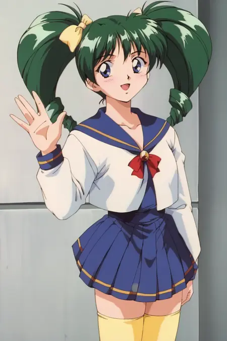 AmytoYobanaideScTwintailsMob, 노랑 허벅지 양말, 파란 장식이 있는 긴 소매와 중앙 슬릿이 있는 흰색 세라후쿠, 노랑 장식이 있는 파란 플리츠 스커트, 레트로 아트스タイル, 젯타이 리ョ우이키, 머리 리본, 1990년대 (스타일), 금색 브로치가 달린 빨간 가슴 리본,