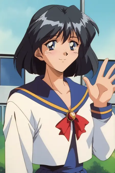 AmytoYobanaideFrecklesHitomi、白いセーラー服(中間スリット、長袖、青い cuffs、黄色のトリム)、レトロなアートスタイル、1990年代(スタイル)、青いセーラー襟(黄色のトリム)、ほくろ、赤い胸リボン(ゴールドのブローチ付き)、青いプリーツスカート(黄色のトリム)
