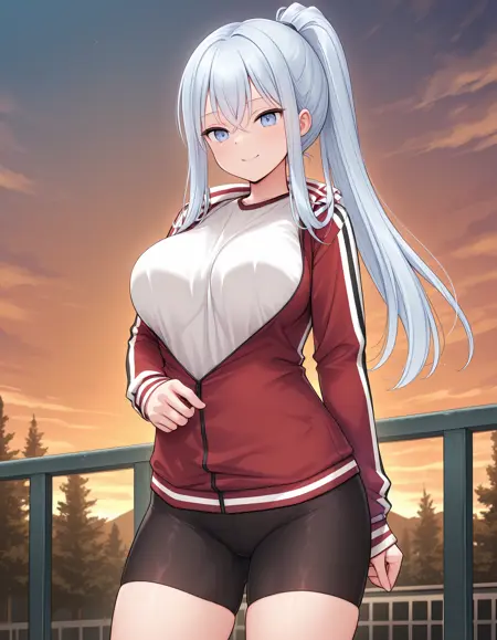 outfit04, tracksuit, Otomeki tracksuit, red tracksuit, jacket, half open jacket, shirt, truck shirt, white shirt, shorts, bike shorts, black shorts, short shorts, ponytail, high ponytail, socks, white socks, shoes, sports shoes,