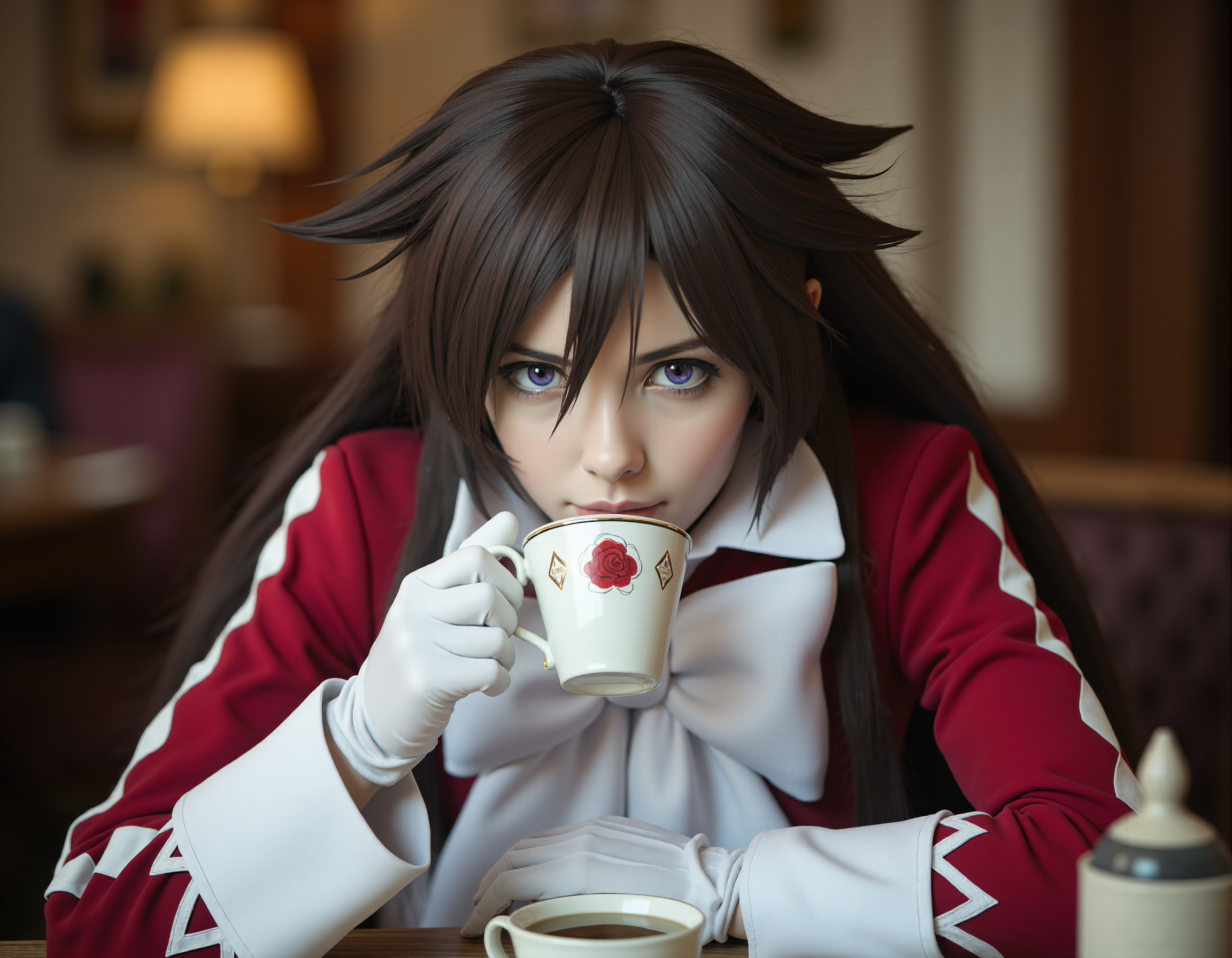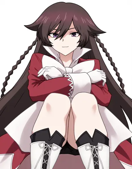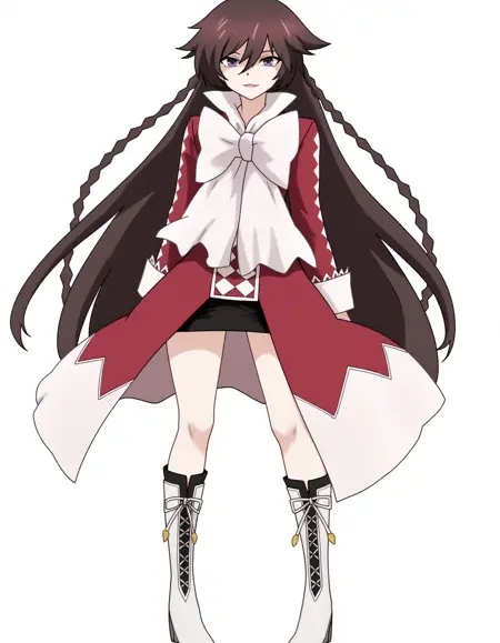 Keyword is AliceBaskerville, but it's better to use the whole phrase "AliceBaskerville, an animated girl with long brown hair and purple eyes wearing a red and white dress"