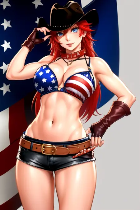 EmilyDawn, 1girl, solo, long hair, blue eyes, large breasts, fingerless gloves, navel, cleavage, red hair, short shorts, midriff, belt, collar, black shorts, bikini top only, fringe trim, flag print, cowboy hat, american flag bikini, bandolier