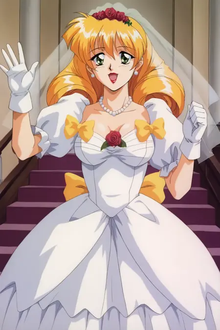 WeddingDress, white wedding dress with white back ribbon and pink bottom and with rose corsage on middle of bust and yellow shoulder bow, bridal veil, flower wreath, pearl necklace, stud earrings, lipstick, white gloves, bride,