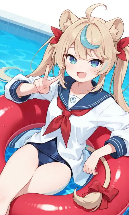 shido lio, lio summer, lion ears, long hair, twintails, hair bow, red bow, sailor dress, sleeves past fingers, blue sailor collar, red neckerchief, school swimsuit, swimsuit under clothes, lion tail, tail bow