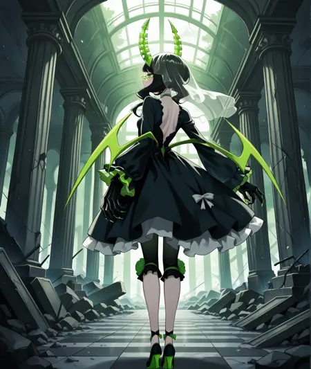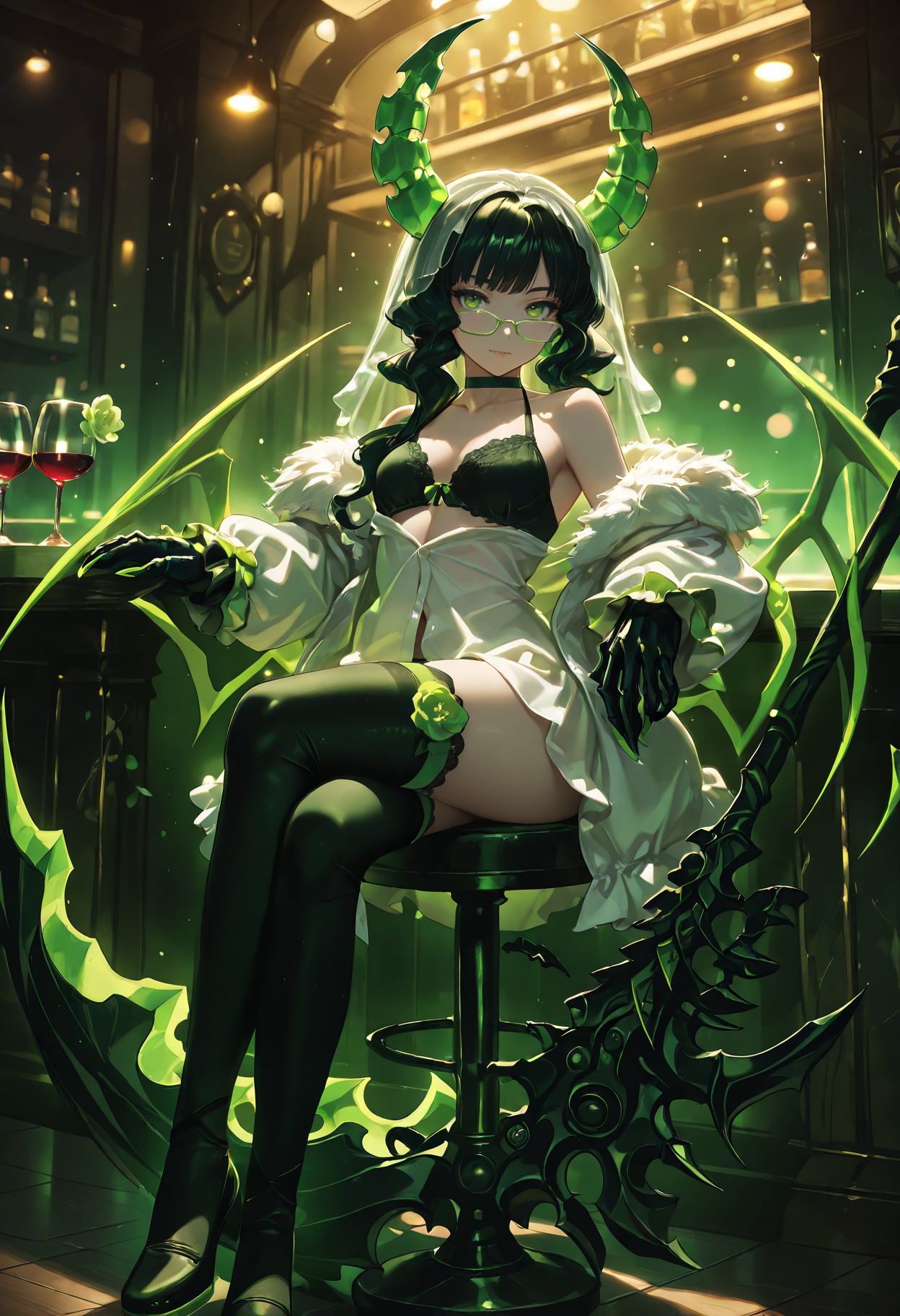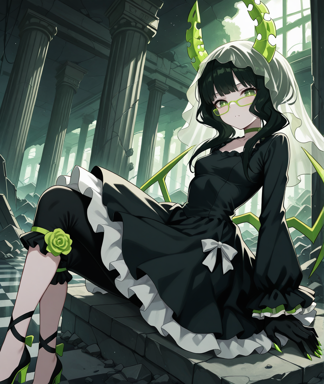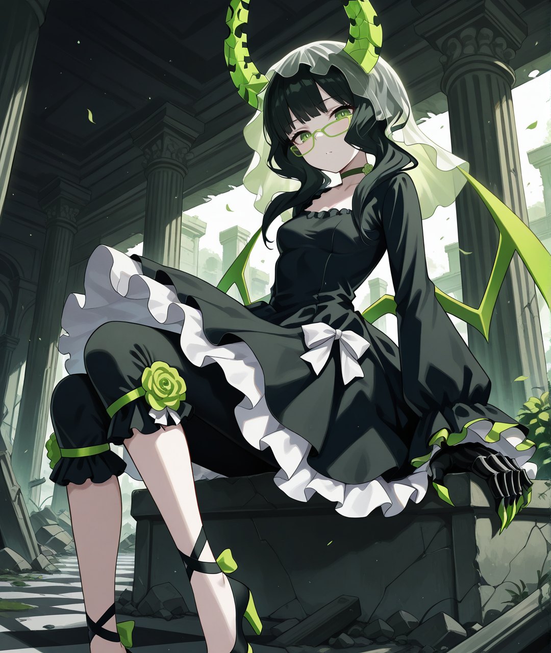 キャラクタータグ: DeadMasterBase、白い肌、緑の角、ブライダルベール、緑の目、眼鏡、緑縁の眼鏡、黒髪、長い髪、カールした髪、黒い首輪、鎖骨、小さな胸、黒いドレス、レイヤードドレス、長い袖、緑のフリル、白いリボン、緑の翼、黒い爪、緑の爪先、黒いレギンス、緑の花の装飾、黒いフリル、ツートーンハイヒール、黒いハイヒール、緑のハイヒール、