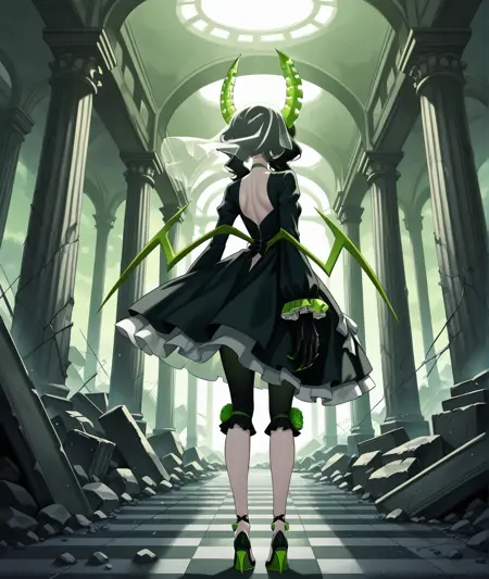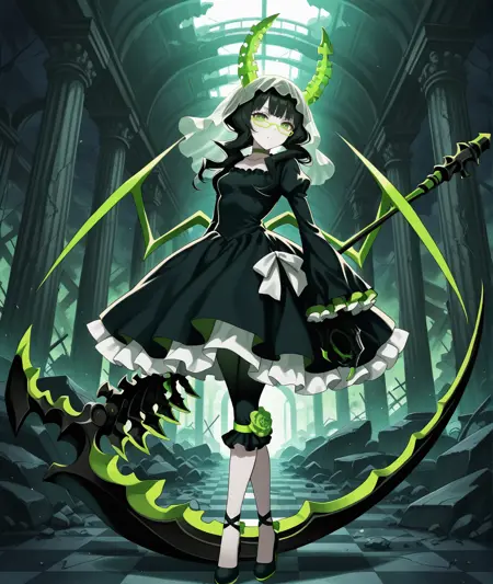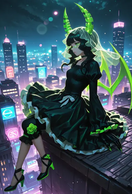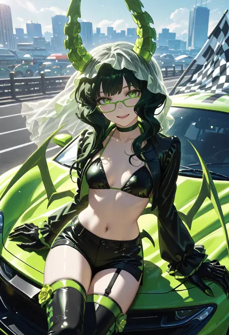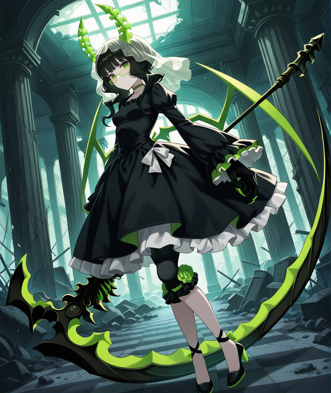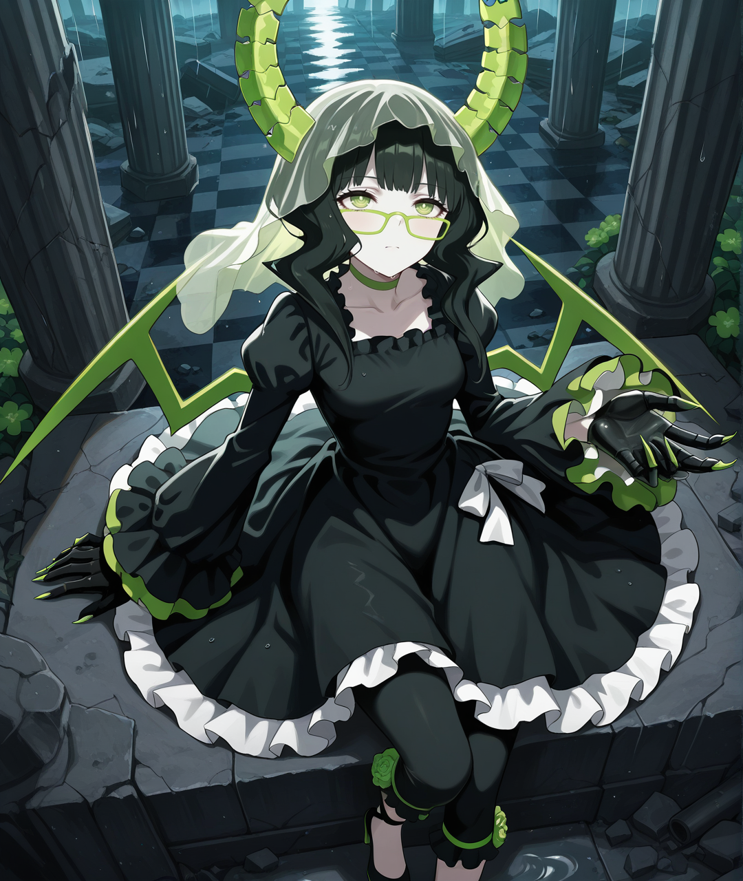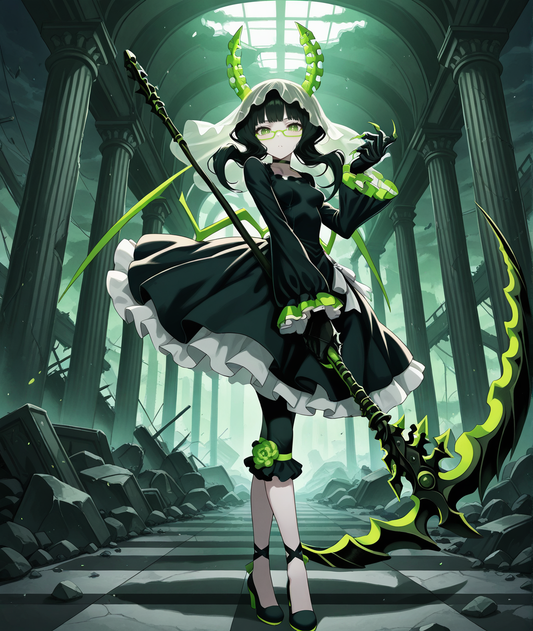 キャラクタータグ: DeadMasterBase、白い肌、緑の角、ブライダルベール、緑の目、眼鏡、緑縁の眼鏡、黒髪、長い髪、カールした髪、黒い首輪、鎖骨、小さな胸、黒いドレス、レイヤードドレス、長い袖、緑のフリル、白いリボン、緑の翼、黒い爪、緑の爪先、黒いレギンス、緑の花の装飾、黒いフリル、ツートーンハイヒール、黒いハイヒール、緑のハイヒール、