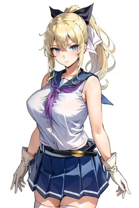 EspadaLove, 1girl, solo, long hair, blue eyes, white shirt, large breasts, pleated skirt, blonde hair, white gloves, white thighhighs, bare shoulders, hair ribbon, high ponytail, sleeveless, miniskirt, blue skirt, sidelocks, serafuku, sailor collar, purple neckerchief, belt buckle, purple ribbon