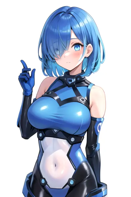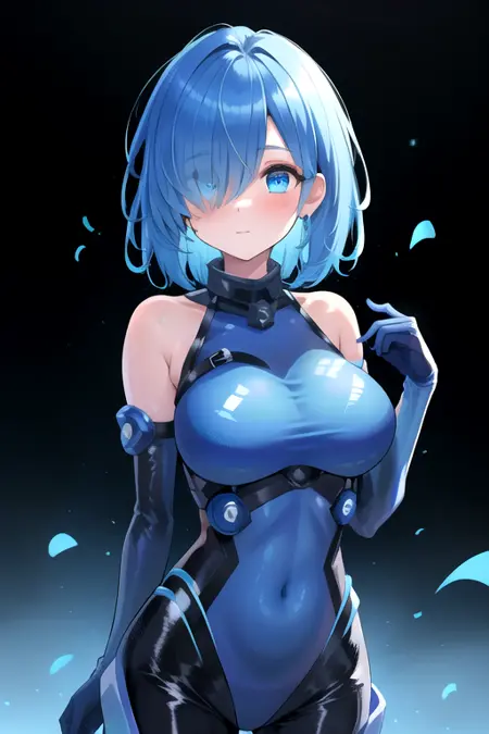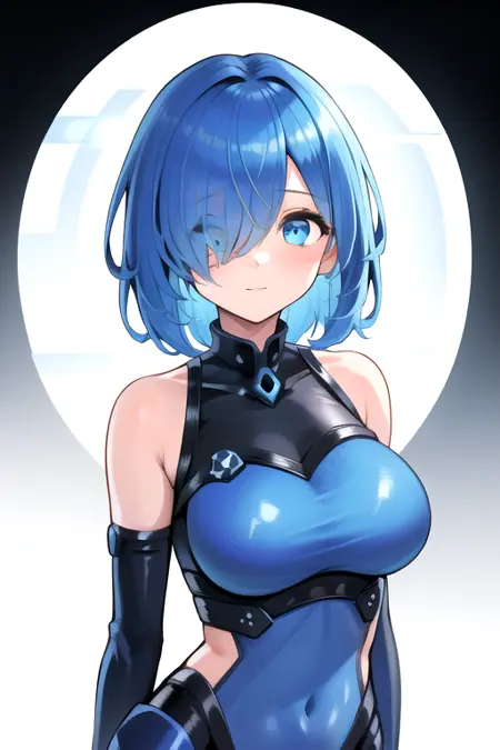 BlueMash, 1girl, solo, breasts, short hair, blue eyes, large breasts, elbow gloves, bare shoulders, blue hair, sleeveless, black gloves, hair over one eye, blue leotard, blue gloves, blue bodysuit,