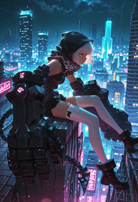 角色标签:StrengthBase、深色皮肤、橙色眼睛、白色头发、短发、裸露肩膀、小乳房、黑色连帽衫、帽子戴起、黑色短裙、无袖、盔甲、黑色护腕、机械手、巨型护腕、黑色手枪、黑色尾巴、尾部盔甲、黑色短裤、黑色丝带、白色过膝袜、黑色靴子,