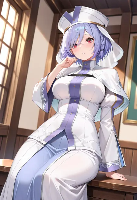 低めのロングポニーテール、編み込み、赤い目、青紫色の髪、ショートヘア、