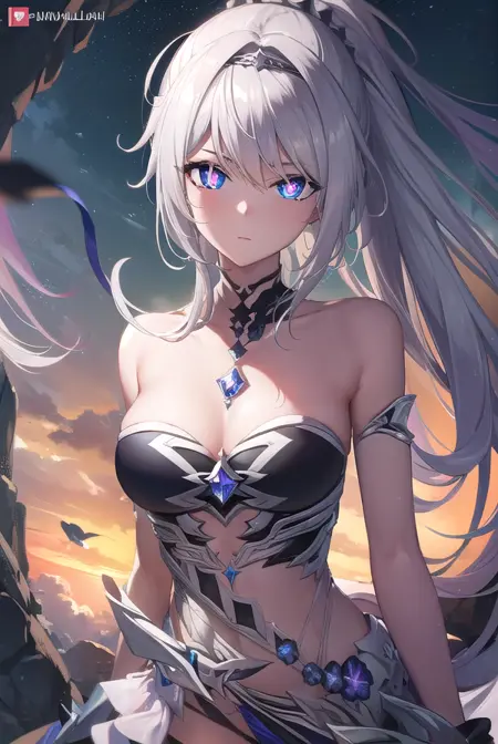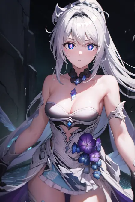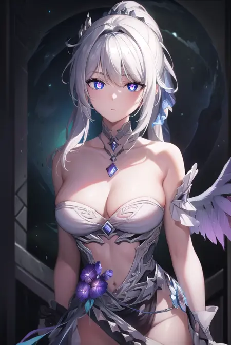 基安娜·卡斯兰娜·终焉赫雪尔,马尾辫,臂环,黑色手套,黑色双手,蓝色眼睛,(明亮瞳孔:1.5),王冠,分离衣领,连衣裙,手套,头发遮住眼睛,发带,紫色双手,侧发,无吊带,无吊带连衣裙,大腿绑带,大腿,白色连衣裙,白发,翅膀,